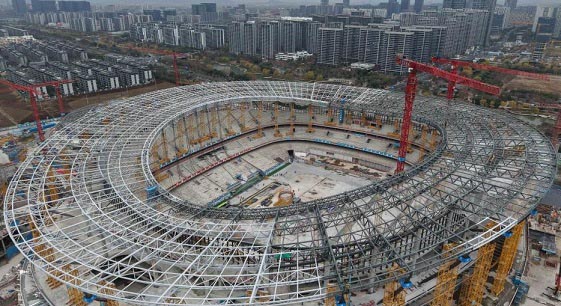 浙江杭州:余杭国际体育中心项目钢结构屋盖桁架合龙